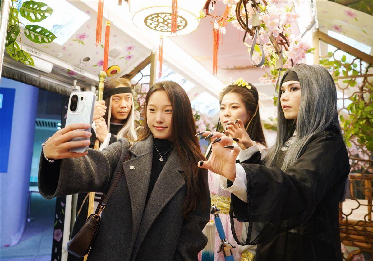 记者在襄阳东站公交站看到,“侠义襄阳接待您”的宣传语相配肃穆,三辆掩盖一新的武侠风主题公交车静静等候,驾驶员身着细巧古装,扮相惟妙惟肖。